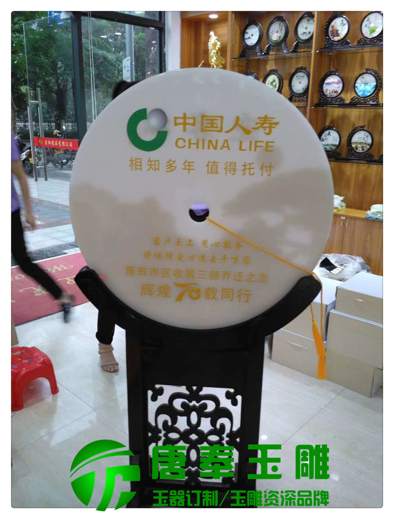 中國人壽周年紀(jì)念浮雕公司logo玉平安扣用于竣工開業(yè)、上市慶典、形象宣傳、入司紀(jì)念、團(tuán)體聚會等地方,浮雕圖案,公司logo,刻字等,既有品位又有收藏價值。